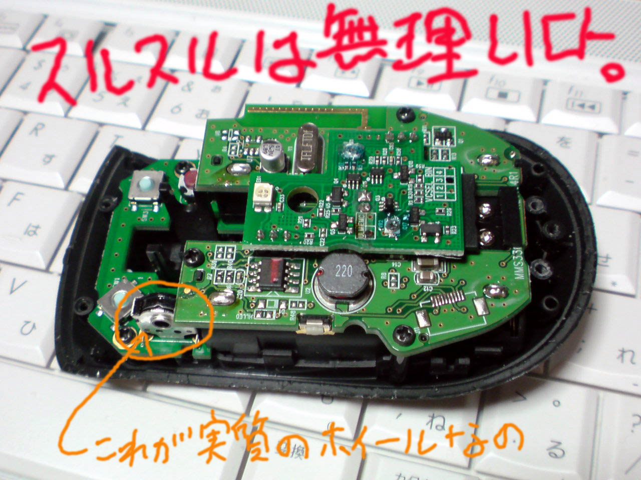 ヘタレ的予想ではホイールの回転そのものをレーザー(ないしは他の光学式)感知していて、クリクリ間はホイールをベアリング的な物で押さえていると思ったのでした。