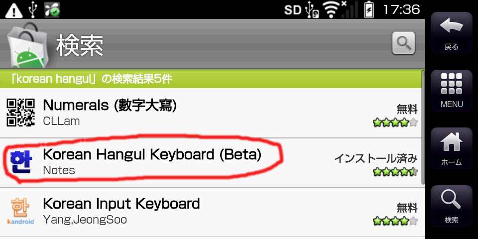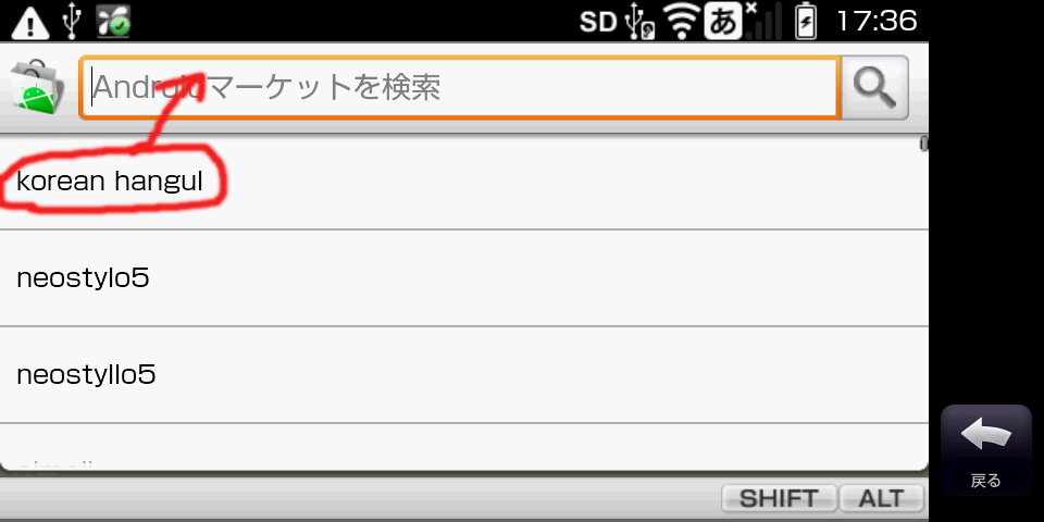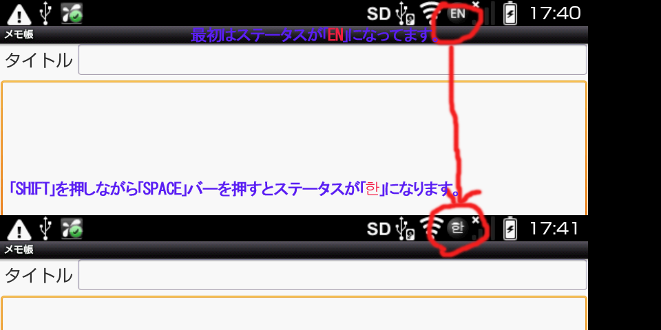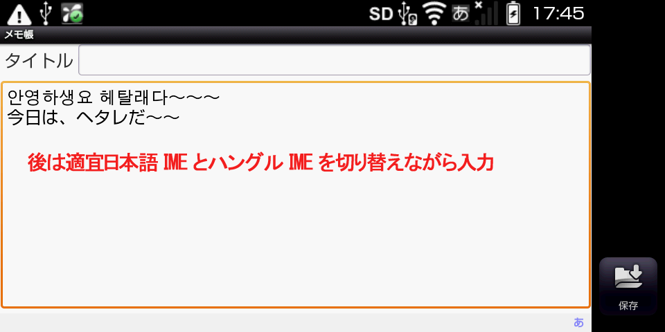 今回はweb上でIS01によるハングル入力方法の紹介サイトが見つからなかったため丁寧に書いてみました。