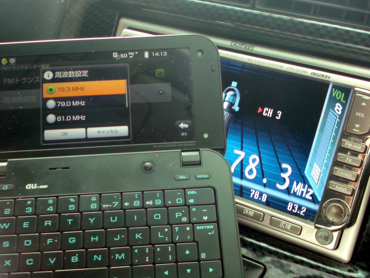 IS01に入っている音楽の再生音をFM電波にして至近距離へ飛ばしちゃうと言うもの。