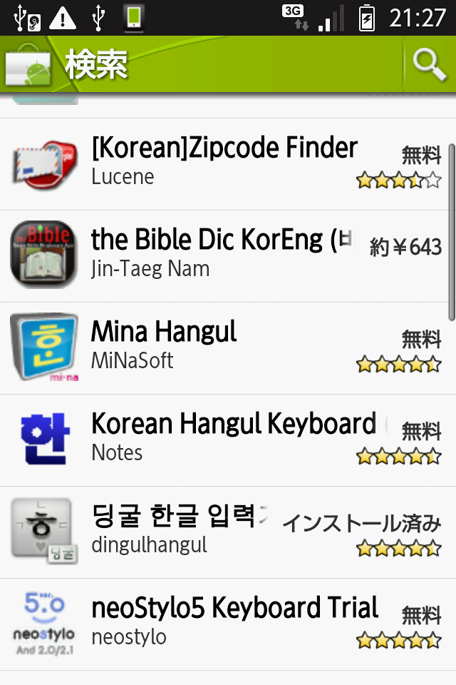 まずは、アンドロイドマーケットに行っていただき「hangul」で検索します。