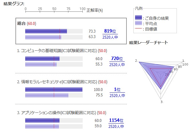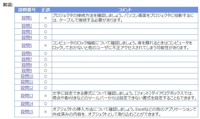 内容的には、「コンピュータの基礎知識」、「情報モラル・セキュリティ」、「アプリケーションの操作」が5問ずつのようだ。