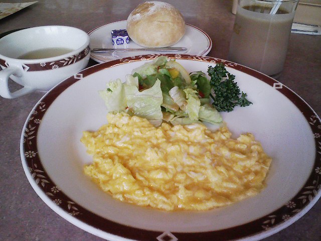 コーヒーとスープとパンとスクランブルエッグとお野菜・・・