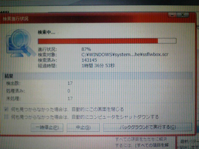 ただいまウイルスバスターをインストールしたのちのフルスキャン中です。