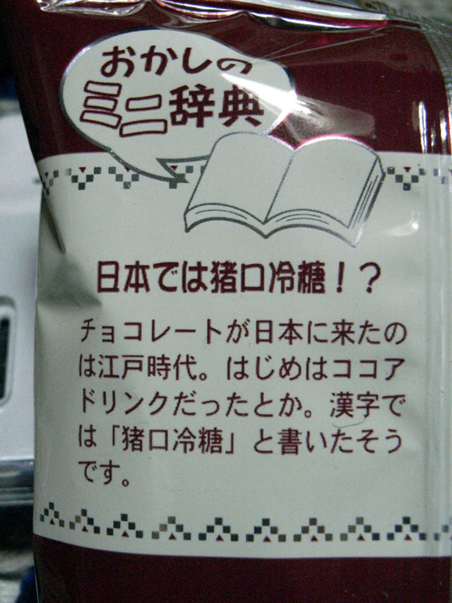 日本にチョコが来たときはココアドリンクでそれを漢字で「猪口冷糖」とかいたそうな。。。