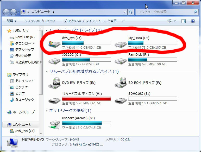 母艦のdv5にWindows7を入れてからHDDを2つのパーティションに割ってみました。